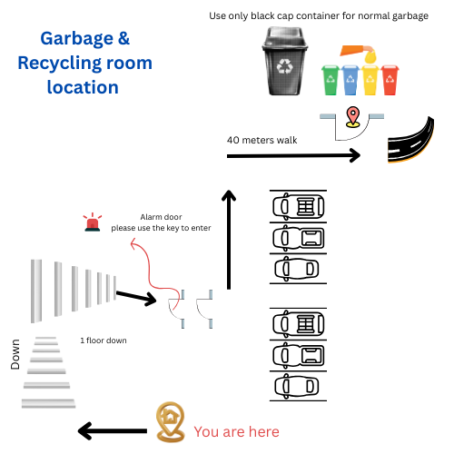 - Direction to the garbage room shown in the layout